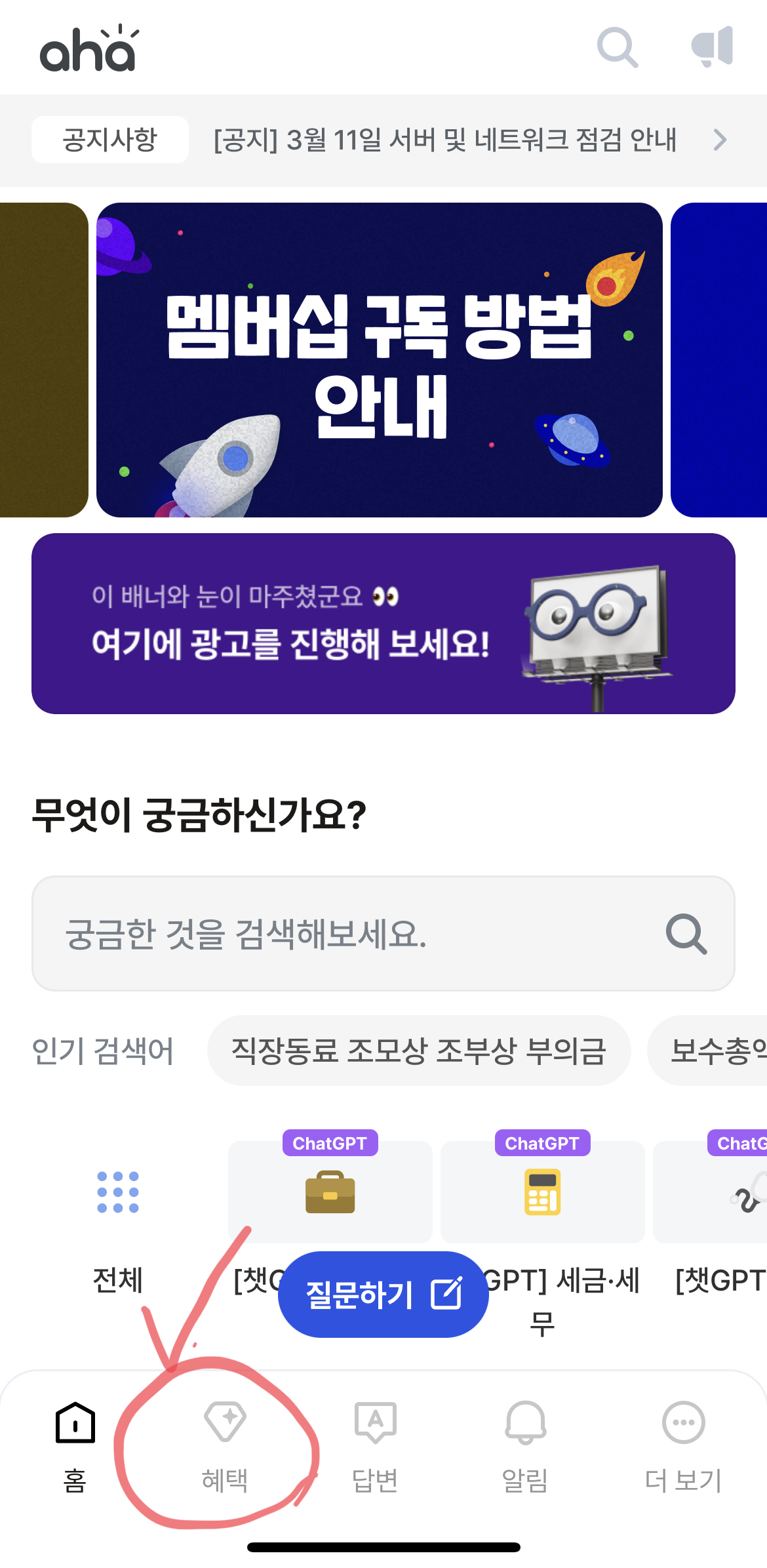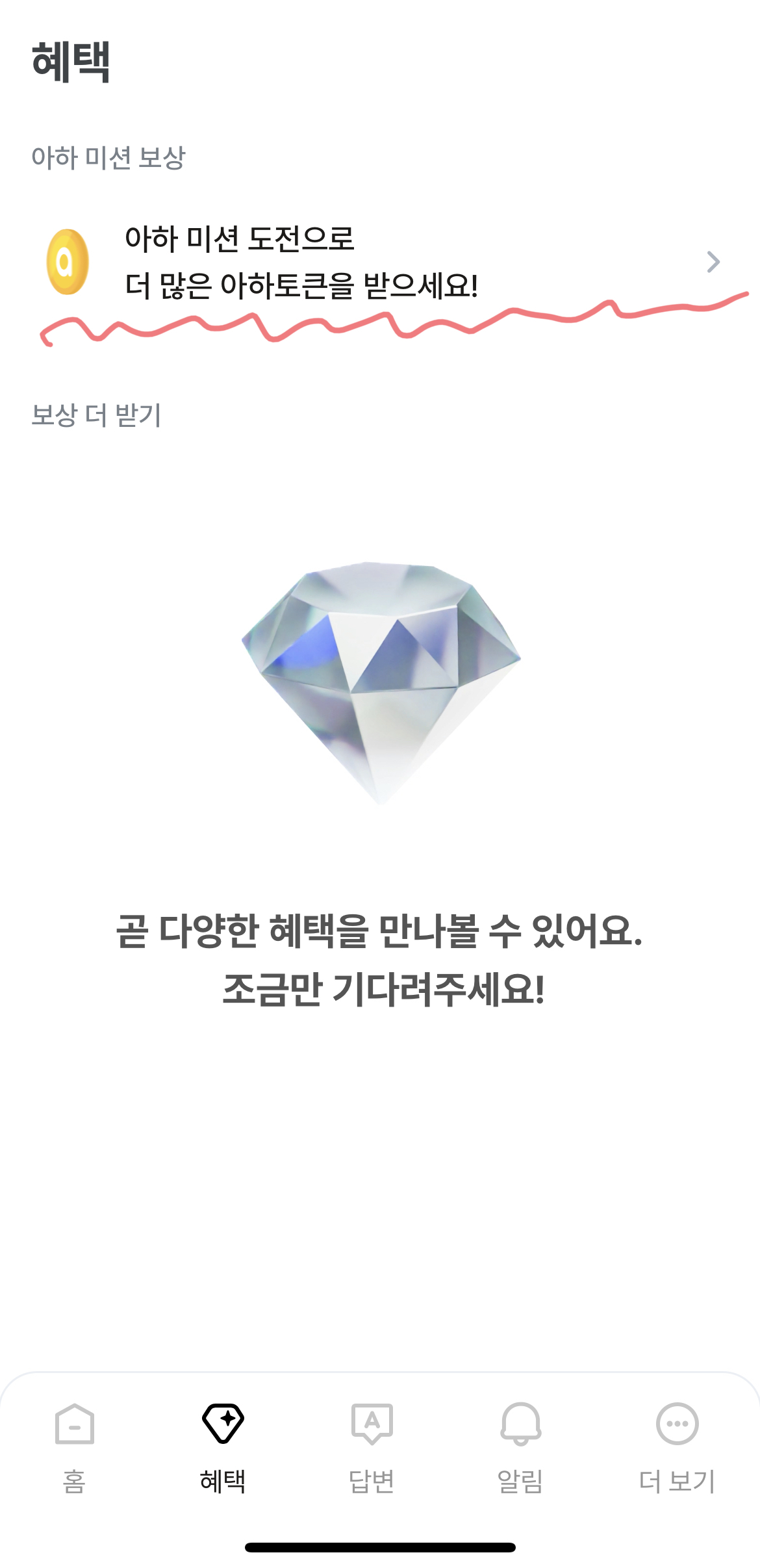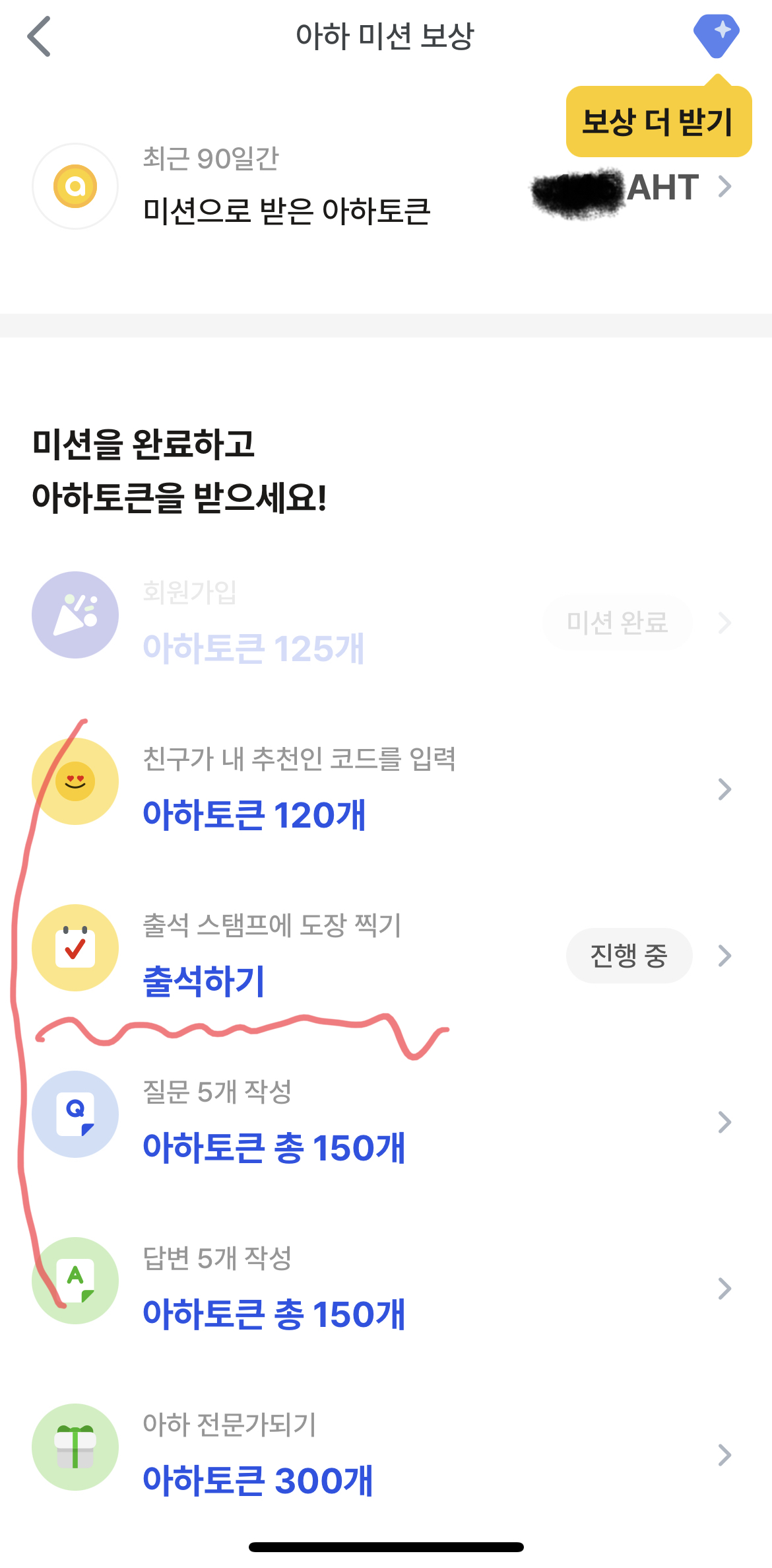혜택란 상단에 '아하 미션 도전으로 더 많은 아하토큰을 받으세요!'를 클릭~