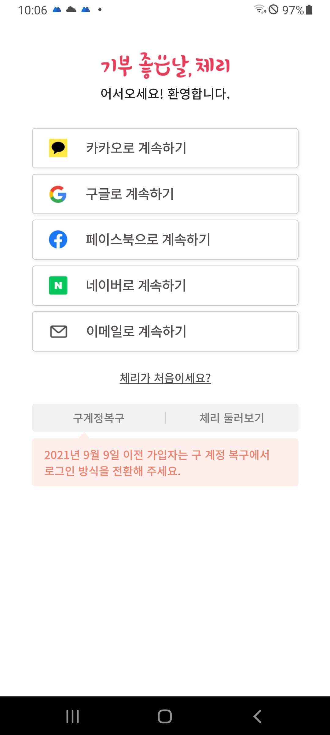 회원가입도 카카오톡, 구글, 네이버, 페이스북, 이메일 등으로 쉽게 가입이 가능하다.