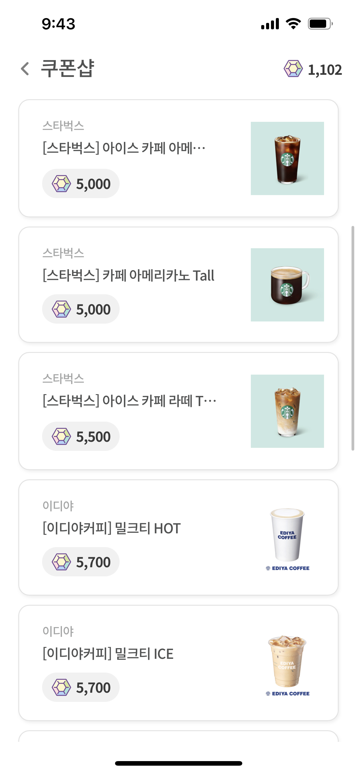 모은 포인트로는 스타벅스, 편의점, 도미노, 교촌, 올리브영 등 다양한 기프티콘을 구매할수 있다.